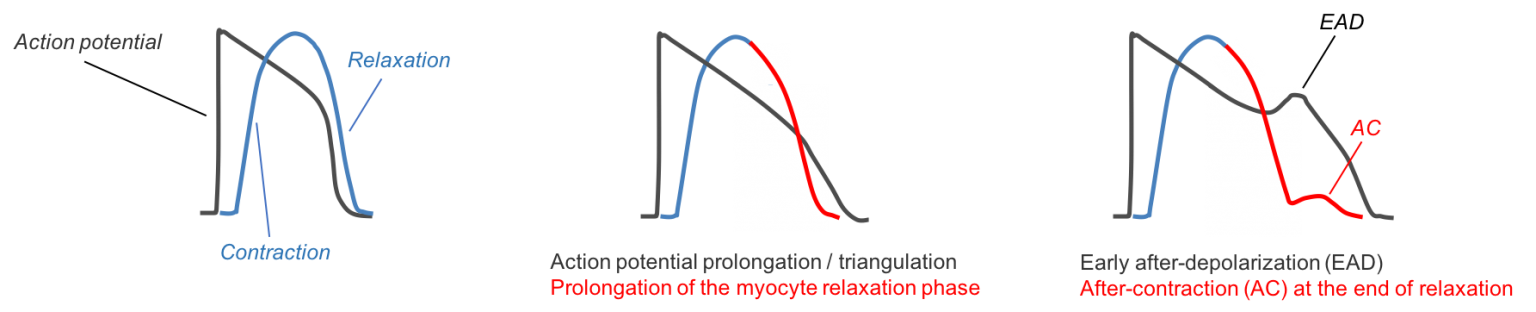 上方右图: 关键的促心律失常触发因素(例如早后去极化,EAD)会在收缩瞬态图中体现为后收缩(AC)。