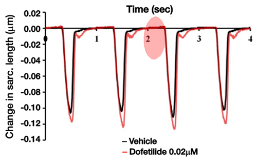 图 1: 下方图片: 促心律失常检测的实际案例;图中展示了应用 多非利特 (Dofetilide, 0.02µM) 后产生后收缩 (AC) 的过程(改编自 Nguyen et al., 2017)