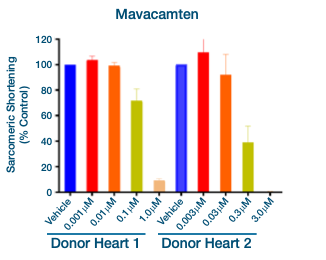 在上方图 5 中,来自两名不同健康捐赠者的心肌细胞显示,在应用肌球蛋白抑制剂 Mavacamten 后,肌节收缩减弱(负性肌力作用)