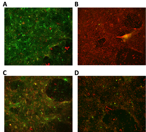 图 1(上方)显示了经过 72 小时处理的人 DRG 神经元培养物:(A) 溶媒对照,(B) 溶媒对照随后加入 0.1% 皂苷,(C) 50µM 奥沙利铂,以及 (D) 500µM 奥沙利铂。通过钙黄绿素(绿色)和乙锭同源二聚体(红色)荧光对细胞活力和细胞通透性进行了测定。
