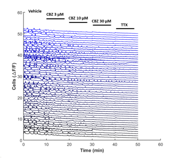 在图 2(上方)中,加载了 Fluo-8(钙离子荧光探针)的人脊髓器官型切片在背角区域表现出自发性钙活动。该图展示了成像中单个神经元的自发性钙瞬变。来自不同神经元的钙离子迹线沿 y 轴堆叠排列。应用递增浓度(3µM、10µM、30µM)的卡马西平 (carbamazepine )会降低自发性钙脉冲的频率。在实验结束时加入 1µM 的河豚毒素 (Tetrodotoxin)